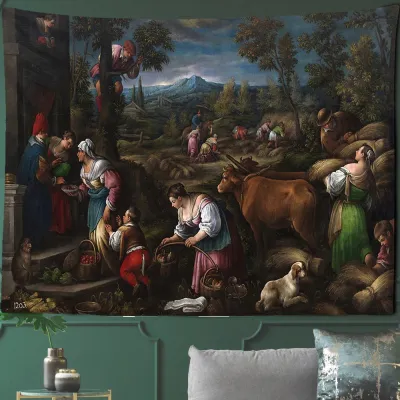 Court Woman Gothic Architecture Tapestry Wall Art with Rose Scenery & Pigeons